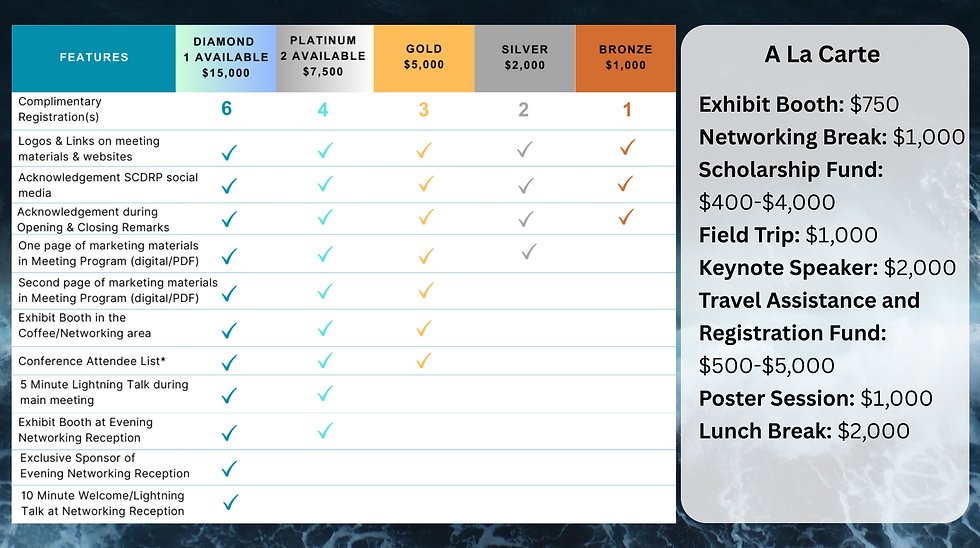 Our Meeting Sponsors make SCDRP Annual Meetings possible! Sponsorships are used to offset meeting costs, provide scholarships for students and rising professionals, and elevate meeting content and activities.